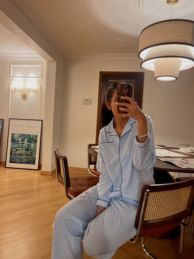 A timeless, classic sleepwear staple that's designed for slow mornings and unhurried nights. Crafted in soft, thick 100% cotton poplin fabric, that is light and breathable. Navy piping for a tailored finish.